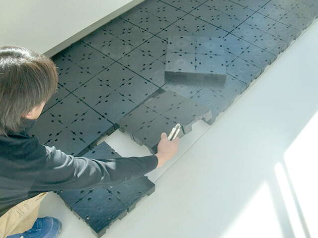 3、その上に、新しいタイルカーペットを貼っていきます。隙間が出来ない様、1枚ずつ丁寧に!